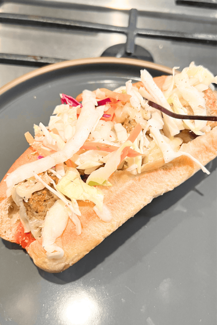 While the meatballs are cooking, grab about ยฝ cup of coleslaw mix (just the shredded cabbage โ no dressing).