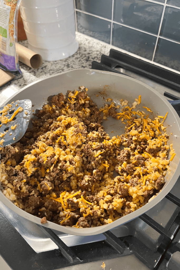 - Stir in cooked cauliflower rice and half the cheese. Remove from heat.